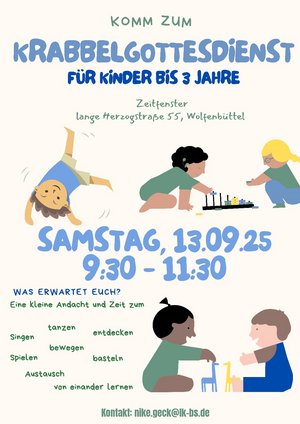 Ab sofort bis einschließlich Februar 2026 findet an jedem zweiten Samstag im Monat in zentraler Lage mitten in der Wolfenbütteler Innenstadt (Lange Herzogstraße 55) von 9.30 Uhr bis 11.30 Uhr ein Krabbelgottesdienst mit Nike Geck statt. Es wird gemeinsam gesungen, gespielt, gebastelt, getanzt und geschnackt. Eine Stillecke, ein Wickeltisch und eine Möglichkeit zum Breiaufwärmen sind vorhanden.